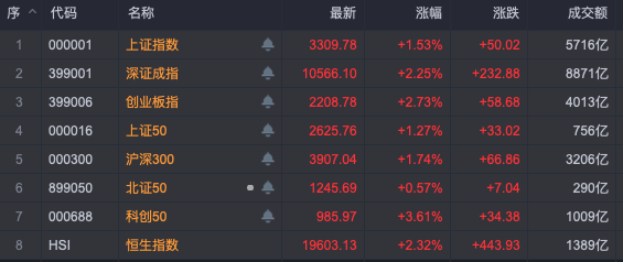 今日,A股探底后强势回升,各主要股指基本以全日最高点报收,上证指数收复3300点,创业板指也重回2200点之上,沪深300站上3900点,科创50指数则大涨3.61%。市场近4400只个股上涨,成交温和放大至1.49万亿元。