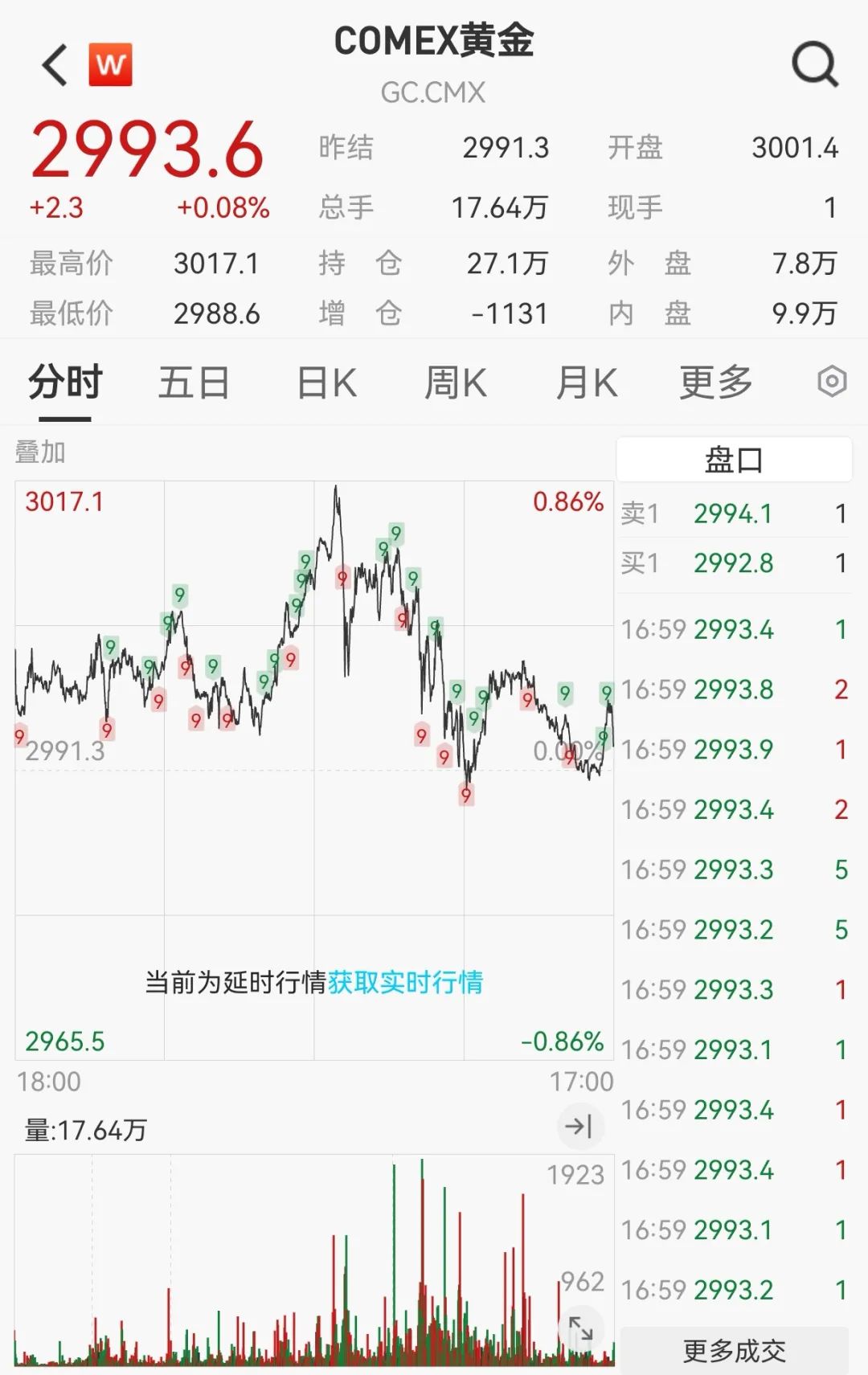 美东时间3月14日,COMEX黄金期货涨0.08%,报2993.6美元/盎司,本周涨2.73%。在周四首次突破3000美元关口的基础上,进一步刷新盘中历史高位至3017.10美元。