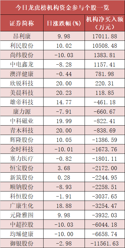 盘后龙虎榜数据显示,机构现身多股,其中昂利康等股票呈现机构资金净买入,御银股份等股票呈现机构资金净卖出。
