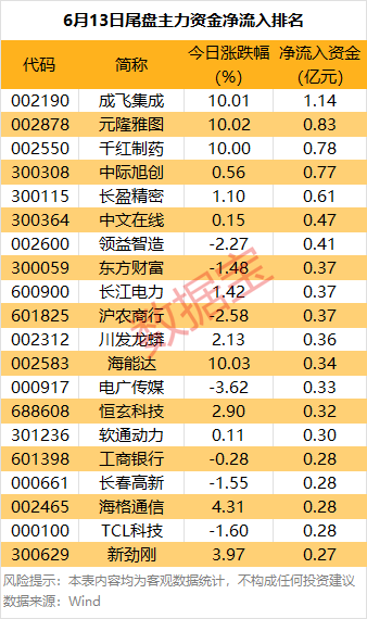 此外,元隆雅图、千红制药和中际旭创等尾盘主力资金净流入居前。