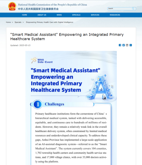 在第78届世界卫生大会(WHA78)期间,以“数智赋能初级卫生保健 促进全民健康覆盖”为主题的中国专场边会引发国际社会广泛关注,中国利用数智技术赋能初级卫生保健的有关经验也获广泛赞誉。国家卫生健康委员会英文官网同步开设专栏,展示了用数智赋能基层卫生的中国实践。其中,讯飞医疗智医助理凭借在基层医疗智能化赋能方面的突破性应用入选。这标志着人工智能辅助基层诊疗领域的技术突破与规模化应用获得了国家层面的高度认可,生动诠释了"健康中国"战略下数字技术与医疗卫生深度融合的创新路径,也为全球基层医疗发展提供了中国智慧和中国方案。